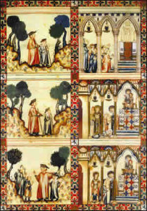 de Santa María; esto fue debido a la gran devoción que tenía a la Virgen María y de ahí el gran numero de catedrales españolas que tienen su advocación. Compuesto por 420 himnos en los que está presente la figura del rey, unas veces como autor y otras como inspirador. Las Cantigas, finalizadas en 1279, fueron escritas en dialecto gallego-portugués para ser cantadas y contienen, además de poesía y música, también pintura, ya que cientos de miniaturas acompañan a los manuscritos y relatan visualmente los acontecimientos. Todas las escenas van encuadradas por una orla, en los ángulos de cada recuadro, los escudos de Castilla y León y en las primeras líneas el águila de la Casa de Suabia.