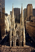 El edificio es de color blanco, debido al mármol y a la piedra que se emplearon procedentes de Nueva York y Massachusetts, pero a diferencia de muchas catedrales góticas, no tiene arbotantes. La portada este, original de Renwick, fue sustituida en 1906 por la Lady Chapel, de Charles Matthews. Se talló con mármol de Vermont y lleva el escudo de armas de León XII; hay una Piedad, también de mármol realizada en 1906 de William O. Partridge. Está dedicada a la Virgen María. La portada oeste, con sus tres puertas de bronce son posteriores, de 1949. Elizabeth Ann Saton, la primera santa estadounidense, está representada en la puerta central y en el interior tiene un santuario con una imagen de bronce. Posee un rosetón cuyos vitrales representan los misterios del Rosario. Detrás del altar hay una cripta subterránea que contiene los restos de todos los cardenales de Nueva York y los restos de Pierre Touissant, un inmigrante haitiano defensor de los pobres.